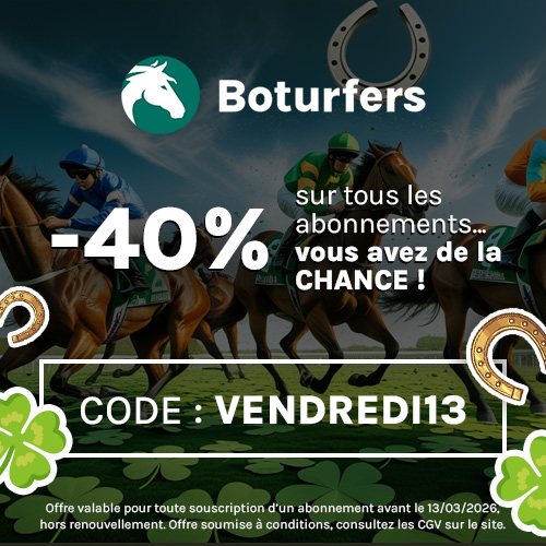 Voir tous nos gainsAvec Boturfers, économisez votre temps et facilitez-vous la vie. Outre nos pronostics turf et nos conseils de jeu prêt à jouer, nous vous donnons accès à toute l'information pertinente sur les partants du jour.